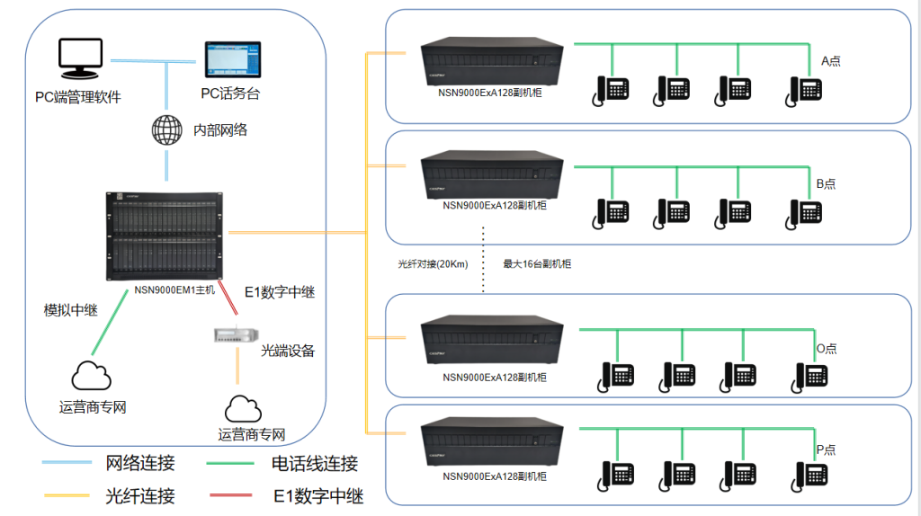 接入8个副机柜(光纤对接,默认20km),容量1024分机