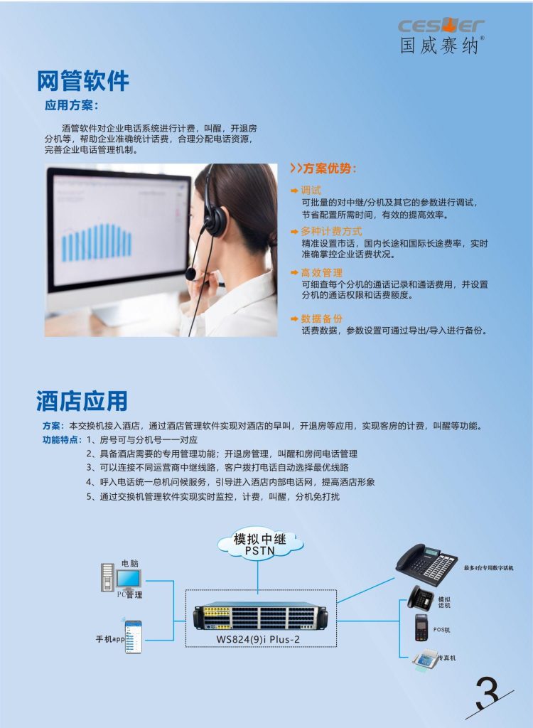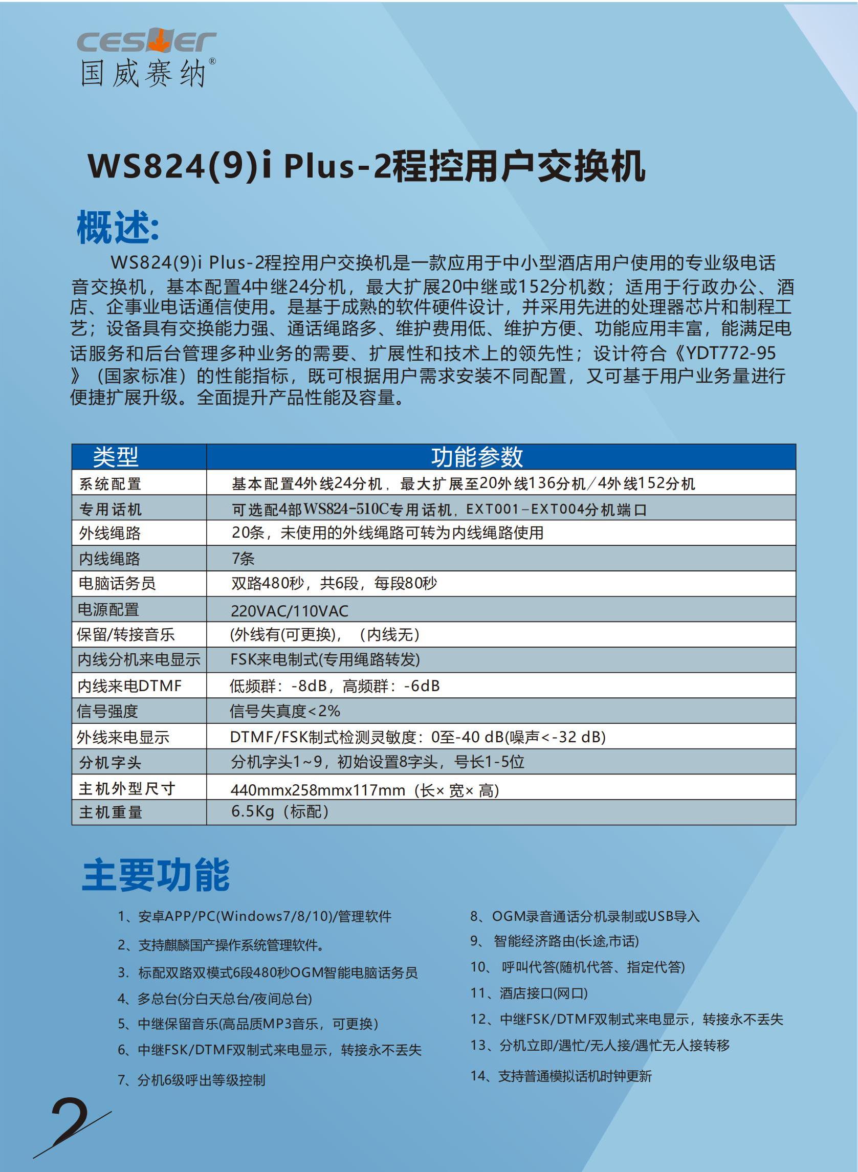 WS824(9)i Plus-2型PBX电话系统升级款是一款先进的通信电话平台,基本配置4中继24分机,可灵活扩到20中继136分机或4中继152分机;适用于行政办公、酒店、企事业电话通信使用。是基于成熟的软件硬件设计,并采用先进的处理器芯片和制程工艺;设备具有交换能力强、通话绳路多、维护费用低、维护方便、功能应用丰富,能满足电话服务和后台管理多种业务的需要,具备充分的开放性、扩展性和技术上的领先性;设计符合《GB/T14381-93》(国家标准)的性能指标。